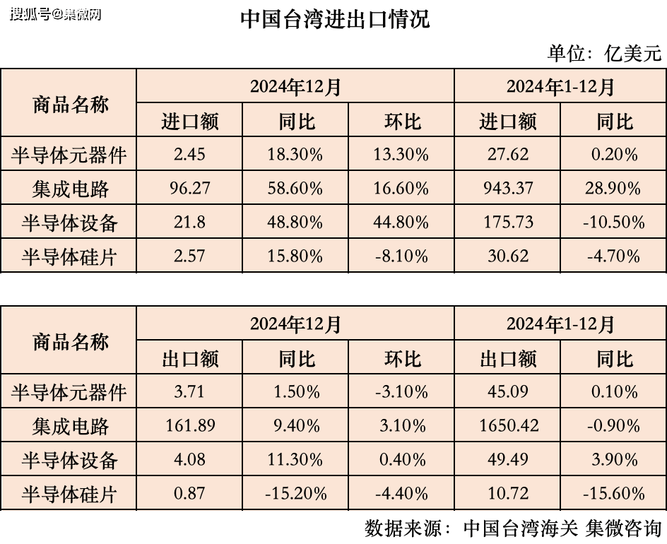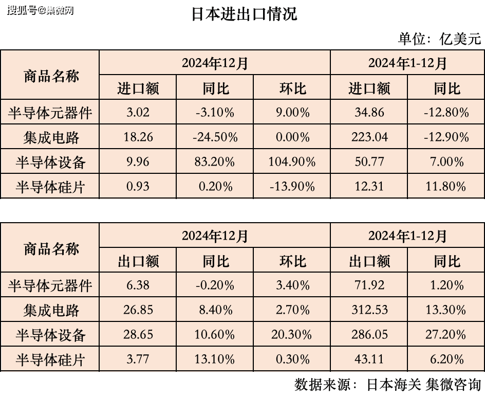 2024年1-12月,日本半导体器件出口金额71。92亿美元,集成电出口金额312。53亿美元,半导体设备出口金额286。05亿美元,半导体硅片出口金额43。11亿美元。12月,日本半导体器件出口金额6。38亿美元,集成电出口金额26。85亿美元,半导体设备出口金额28。65亿美元,半导体硅片出口金额3。77亿美元。