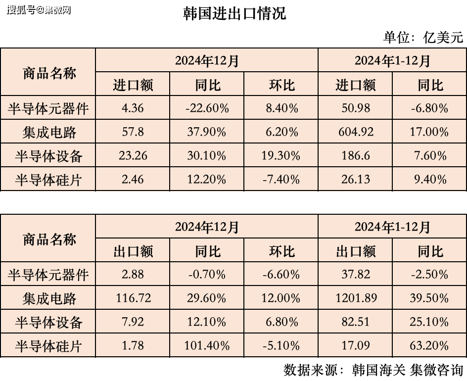 2024年1-12月,韩国半导体器件出口金额37。82亿美元,集成电出口金额1201。89亿美元,半导体设备出口金额82。51亿美元,半导体硅片出口金额17。09亿美元。12月,韩国半导体器件出口金额2。88亿美元,集成电出口金额116。72亿美元,半导体设备出口金额7。92亿美元,半导体硅片出口金额1。78亿美元。