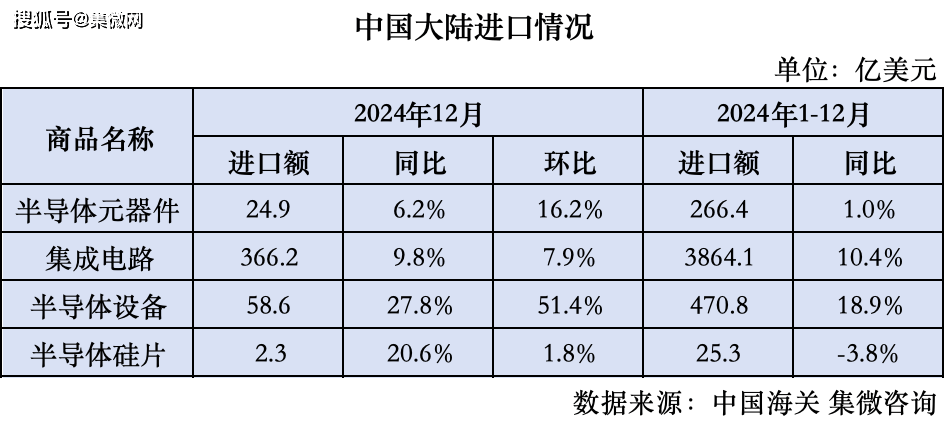 1-12月,半导体器件进口金额266。4亿美元,同比上升1。0%;集成电进口金额3864。1亿美元,同比上升10。4%;半导体设备进口金额470。8亿美元,同比上升18。9%;半导体硅片进口金额25。3亿美元?。