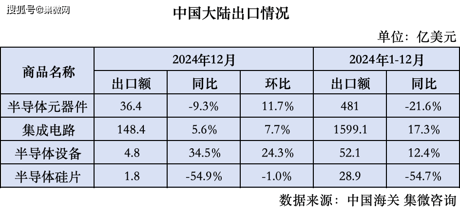 12月,中国半导体器件出口金额36。4亿美元,环比上升11。7%,同比削减9。3%;集成电出口金额148。4亿美元,环比增加7。7%,同比增加5。6%;半导体设备出口金额4。8亿美元,环比增加24。3%,同比增加34。5%;半导体硅片出口金额1。8亿美元,环比削减1。0%,同比削减54。9%。