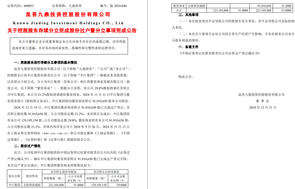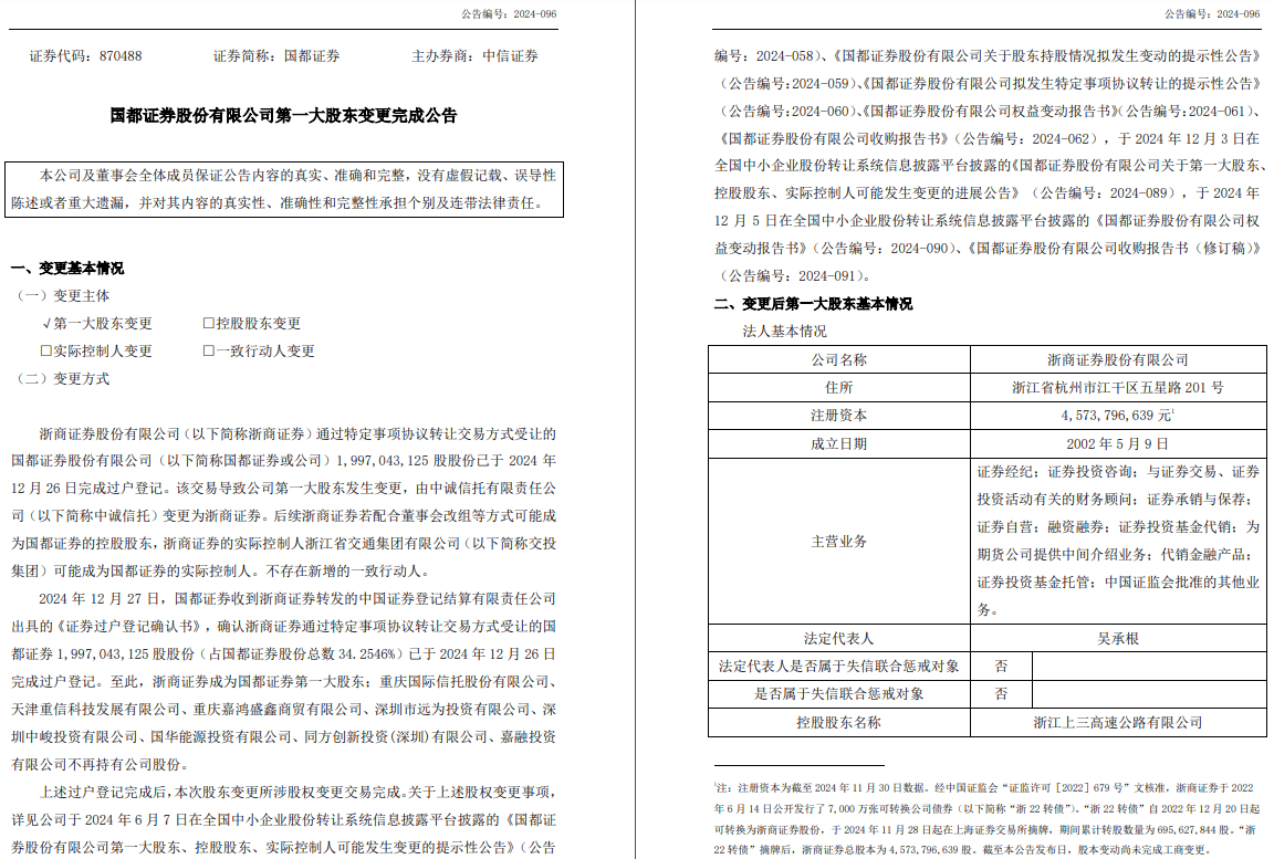 浙商证券通过特定事项和谈让渡买卖体例受让的都城证券1,997,043,125股股份已于2024年12月26日完成过户登记。该买卖导致公司第一大股东发生变动,由中诚信任无限义务公司(简称:中诚信任)变动为浙商证券。后续浙商证券若共同董事会改组等体例可能成为都城证券的控股股东,浙商证券的现实节制人浙江省交通集团无限公司(简称:交投集团)可能成为都城证券的现实节制人。不存正在新增的分歧步履人。2024年12月27日,都城证券收到浙商证券转发的中国证券登记结算无限义务公司出具的《证券过户登记确认书》,确认浙商证券通过特定事项和谈让渡买卖体例受让的都城证券1,997,043,125股股份(占都城证券股份总数34。2546%)已于2024年12月26日完成过户登记。至此,浙商证券成为都城证券第一大股东;沉庆国际信任股份无限公司、天津沉信科技成长无限公司、沉庆嘉鸿盛鑫商贸无限公司、深圳市远为投资无限公司、深圳中峻投资无限公司、国华能源投资无限公司、同方立异投资(深圳)无限公司、嘉融投资无限公司不再持有公司股份。
