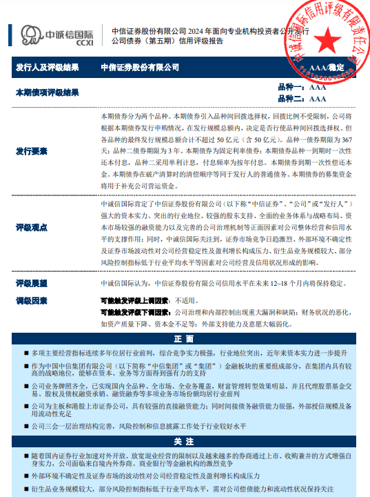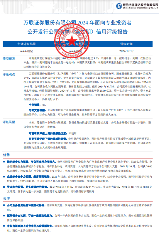结合资信评估股份无限公司通过对万联证券股份无限公司及其拟面向专业投资者公开辟行2024年公司债券(第二期)的信用情况进行分析阐发和评估,确定从体持久信用品级为AAA,万联证券2024年面向专业投资者公开辟行公司债券(第二期)信用品级为AAA,评级瞻望为不变。(结合〔2024〕11142号)。