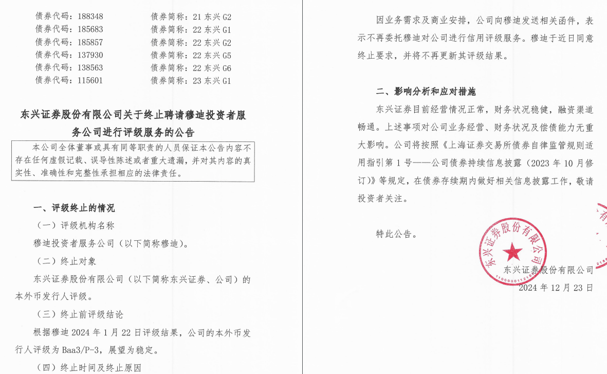 因营业需求及贸易放置,东兴证券向穆迪投资者办事公司(穆迪)发送相关函件,暗示不再委托穆迪对公司进行信用评级办事。穆迪于近日同意终止要求,并将不再更新其评级成果。按照穆迪2024年1月22日评级成果,公司的本外币刊行人评级为Baa3/P-3,瞻望为不变。