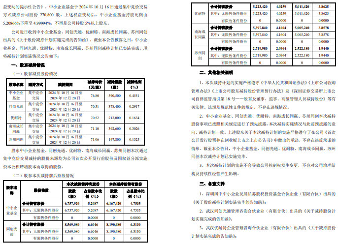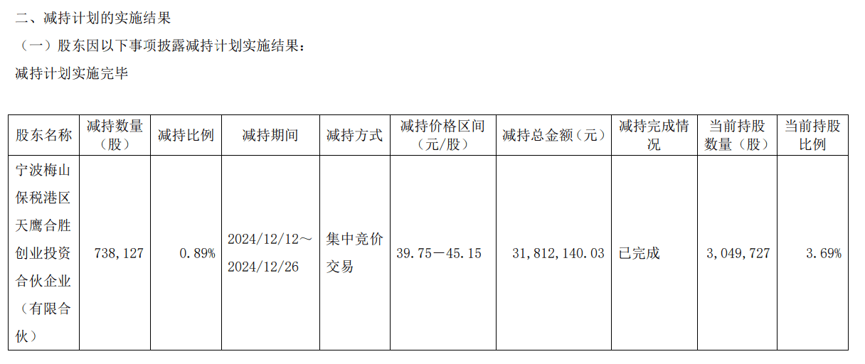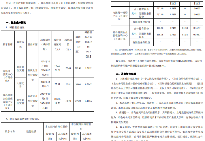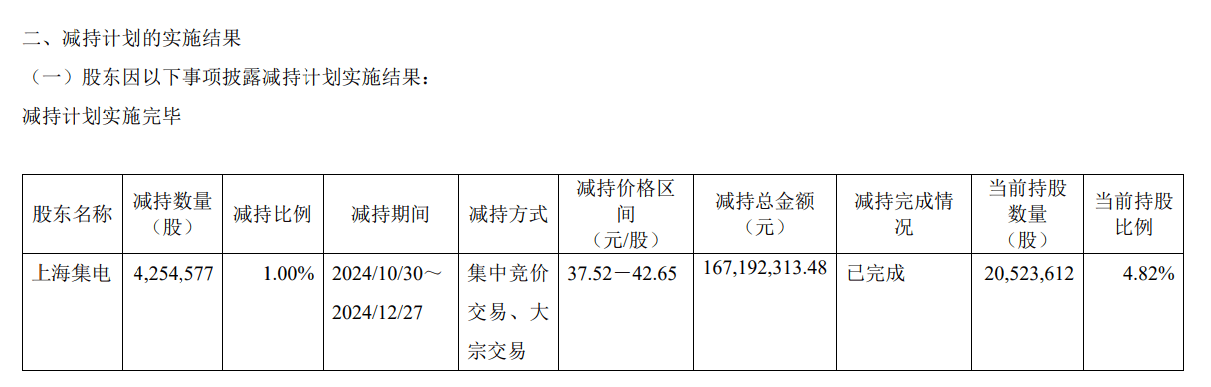 减持前,上海南芯半导体科技股份无限公司(南芯科技)股东上海集成电财产投资基金股份无限公司(简称:上海集电)持有公司股份24,778,189股,占公司总股本的5。82%。因为股东本身运营资金需要,上海集电拟通过集中竞价或大买卖的体例减持其所持有的公司股份数量合计不跨越4,254,577股,占公司总股本的比例合计不跨越1。00%。截至2024年12月27日收盘,上海集电通过集中竞价和大买卖体例累计减持了公司股份4,254,577股,占公司总股本1。00%。本次减持打算已实施完毕。
