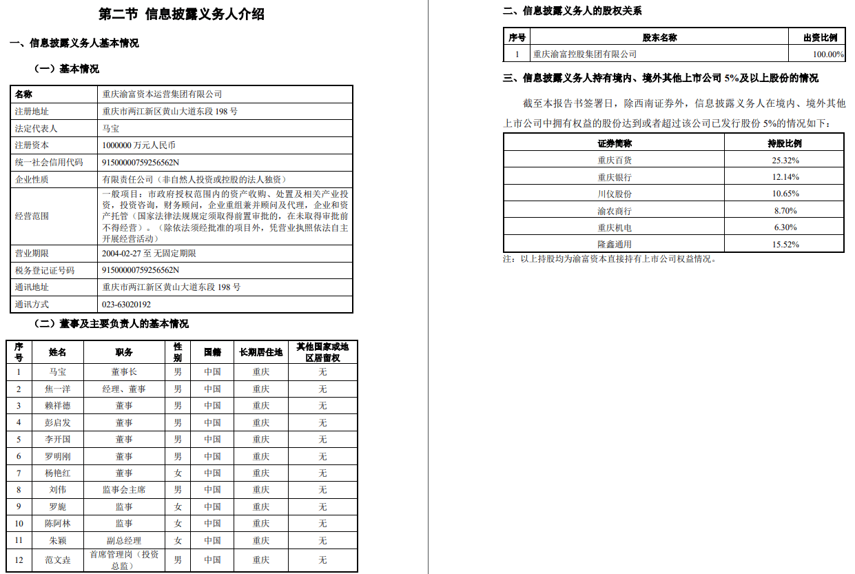 为落实委六届四次五次六次全会及市委、市关于凸起从责从业强化焦点功能整合优化攻坚的工做摆设,西南证券控股股东沉庆渝富本钱运营集团无限公司(简称:渝富本钱)拟将其持有的公司29。51%股权变动至沉庆渝富控股集团无限公司(简称:渝富控股)名下。2024年12月27日,公司收到渝富本钱来函,渝富本钱取渝富控股于当日签订《沉庆渝富本钱运营集团无限公司取沉庆渝富控股集团无限公司之无偿划转和谈》,渝富本钱将所持公司29。51%股权无偿划转至渝富控股。目前,渝富控股持有渝富本钱100%股权,渝富本钱持有公司1,960,661,852股,占公司总股本的29。51%;渝富控股持有沉庆水务控股集团无限公司(简称:水务集团)80%股权(尚未完成变动登记),水务集团持有公司1。50%股权;渝富控股持有沉庆轻纺控股(集团)公司(简称:轻纺集团)80%股权,轻纺集团持有公司0。41%股权。渝富控股、渝富本钱、水务集团及轻纺集团为分歧步履人,合计持有公司31。42%股权。公司现实节制报酬国有资产监视办理委员会。本次权益变更系渝富本钱将其持有的西南证券1,960,661,852股股份(占上市公司股份总额的29。51%)无偿划转至渝富控股。本次权益变更前,渝富本钱间接持有上市公司1,960,661,852股股份,占上市公司总股本的29。51%。本次权益变更后,消息披露权利人将不再持有上市公司股份。