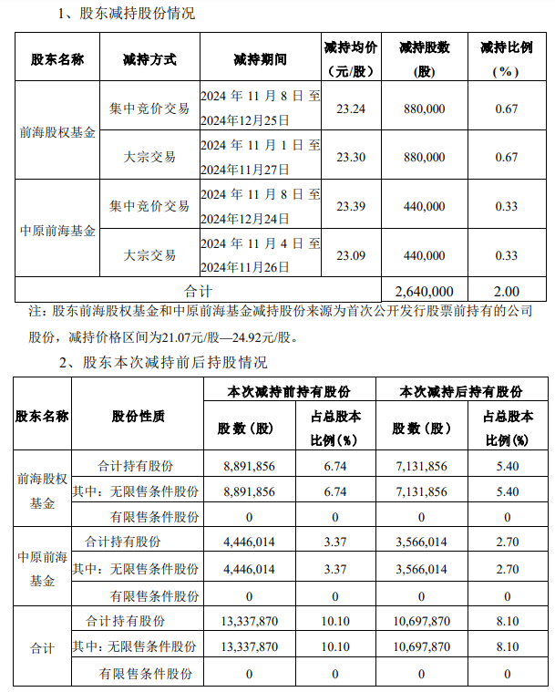 广东博盈特焊手艺股份无限公司(博盈特焊)收到持股5%以上股东前海股权投资基金(无限合股)(以下简称“前海股权基金”)和华夏前海股权投资基金(无限合股)(以下简称“华夏前海基金”)出具的《关于减持股份达到1%暨减持打算实施完成的奉告函》,获悉上述股东于2024年11月27日至2024年12月25日期间,通过大买卖累计减持公司股票140,000股,通过集中竞价体例累计减持公司股票1,180,000股,合计减持所持公司股份比例累计再次达到1%。截至本通知布告披露日,前海股权基金和华夏前海基金减持打算实施完成。