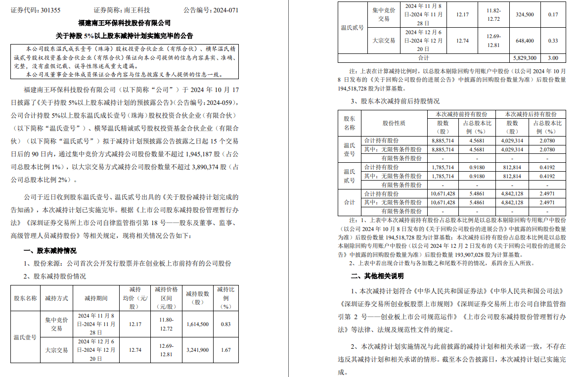 福建南王环保科技股份无限公司(南王科技)合计持股5%以上股东温氏成长壹号《(珠海)股权投资合股企业(无限合股)(以下简称“温氏壹号”)、横琴温氏精诚贰号股权投资基金合股企业(无限合股)(以下简称“温氏贰号”)拟于减持打算预披露通知布告披露之日起15个买卖日后的90日内,通过集中竞价体例减持公司股份数量不跨越1,945,187股(占公司总股本比例1%),公司于近日收到股东温氏壹号、温氏贰号出具的《关于股份减持打算完成的奉告函》,本次减持打算已实施完毕。