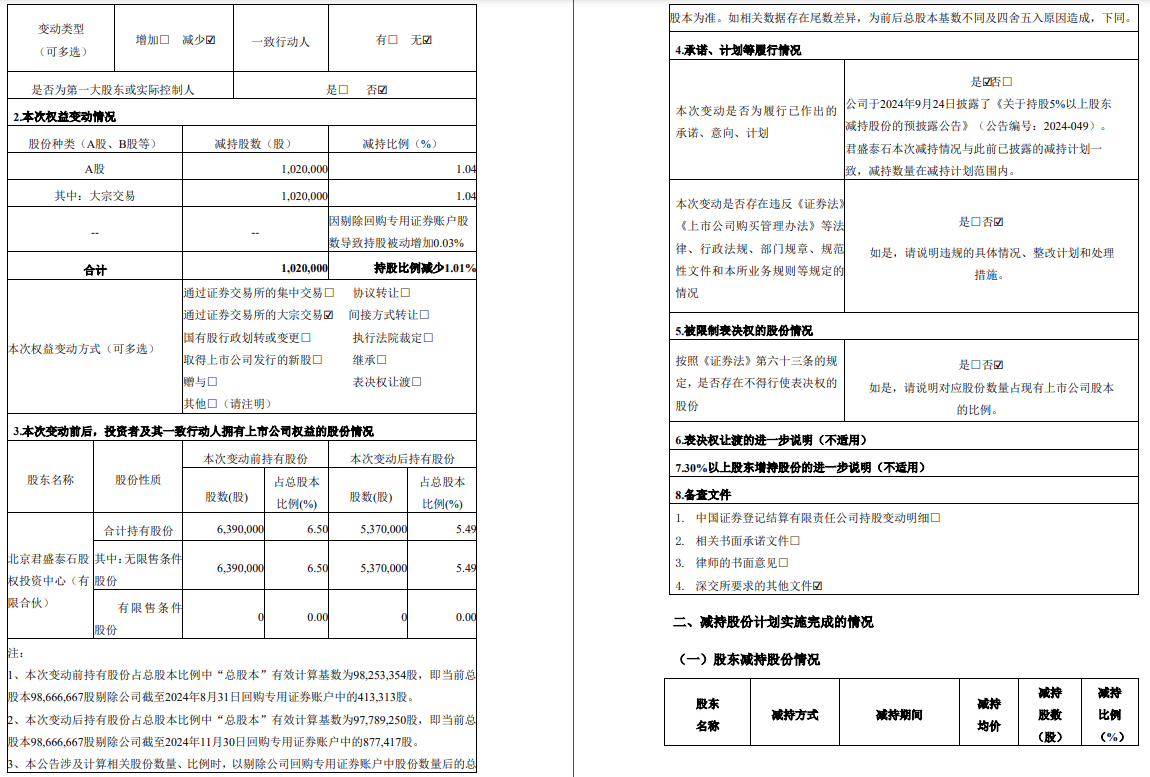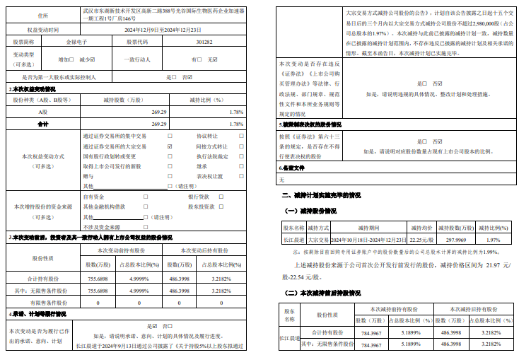 金禄电子科技股份无限公司(金禄电子)原持股7,843,967股(占公司总股本的5。19%)的股东长江晨道(湖北)新能源财产投资合股企业(无限合股)(以下简称“长江晨道”)打算以大买卖体例减持公司股份不跨越2,980,000股(占公司总股本的1。97%,占剔除其时回购公用证券账户中的股份数量后的公司总股本的1。99%)。2024年10月18日,长江晨道通过大买卖体例减持公司股份287,069股,减持后持股比例降至4。9999%,不再是公司持股5%以上的股东。2024年12月24日,公司收到长江晨道出具的《关于减持公司股份跨越1%暨减持打算实施完毕的奉告函》。截至2024年12月23日,长江晨道持股比例降至4。9999%后累计减持公司股份2,692,900股,占公司总股本的1。78%(占剔除目前回购公用证券账户中的股份数量后的公司总股本的比例为1。80%);减持期内其累计减持公司股份2,979,969股,减持打算已实施完毕。