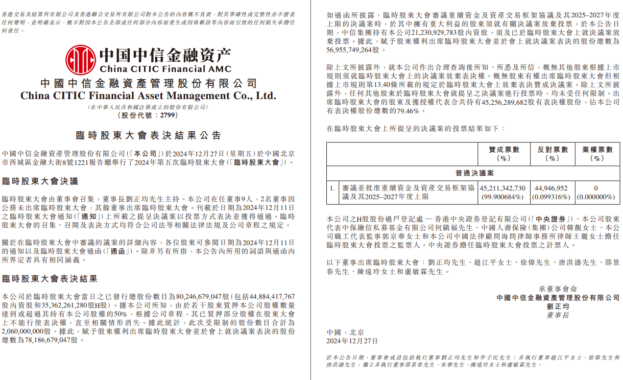 中国中信金融资产办理股份无限公司于2024年12月27日(礼拜五)于中国 市西城区金融大街8号1221演讲厅举行了2024年第五次姑且股东大会(「姑且股东大会」)。 姑且股东大会决议 姑且股东大会由董事会召集,董事长刘正均先生掌管。审议并核准沉续资金及资产买卖框架和谈及其2025–2027年度上限。
