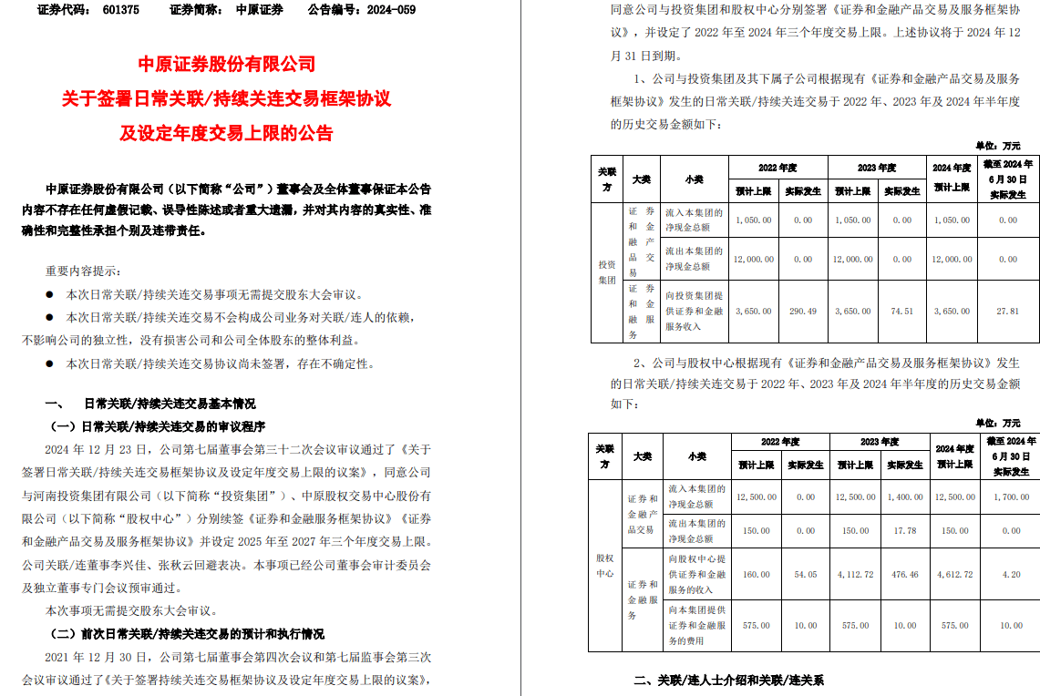 华夏证券第七届董事会第三十二次会议于2024年12月23日以通信表决体例召开。审议通过了《关于调整2024年度工资总额预算方案的议案》《关于2023年度鲁智礼先生薪酬的议案》《关于2023年度菅明军先生薪酬的议案》《2023年度公司高级办理人员薪酬方案》《关于调整总部部分的议案》《关于聘用证券事务代表的议案》《关于签订日常联系关系/持续干系买卖框架和谈及设定年度买卖上限的议案》。同意公司取河南投资集团无限公司(以下简称“投资集团”)、华夏股权买卖核心股份无限公司(以下简称“股权核心”)别离续签《证券和金融办事框架和谈》《证券和金融产物买卖及办事框架和谈》并设定2025年至2027年三个年度买卖上限。公司联系关系/连董事李兴佳、张秋云回避表决。本领项曾经公司董事会审计委员会及董事特地会议通过。