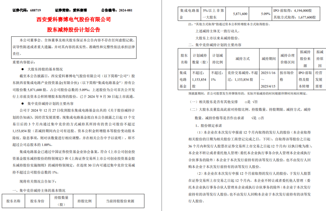 西安爱科赛博电气股份无限公司(爱科赛博)股东陕西省集成电财产投资基金(无限合股)(以下简称“集成电基金”)持有公司股份数5,871,600股,占公司股份总数的5。09%。爱科赛博于2024年12月27日收到股东集成电基金出具的《关于股份减持打算的奉告函》,因运营成长需要,现集成电基金拟自本通知布告披露之日起15个买卖日后的3个月内通过集中竞价的体例减持其所持有的贵公司股份不跨越1,153,854股,即不跨越公司总股本的1。00%。