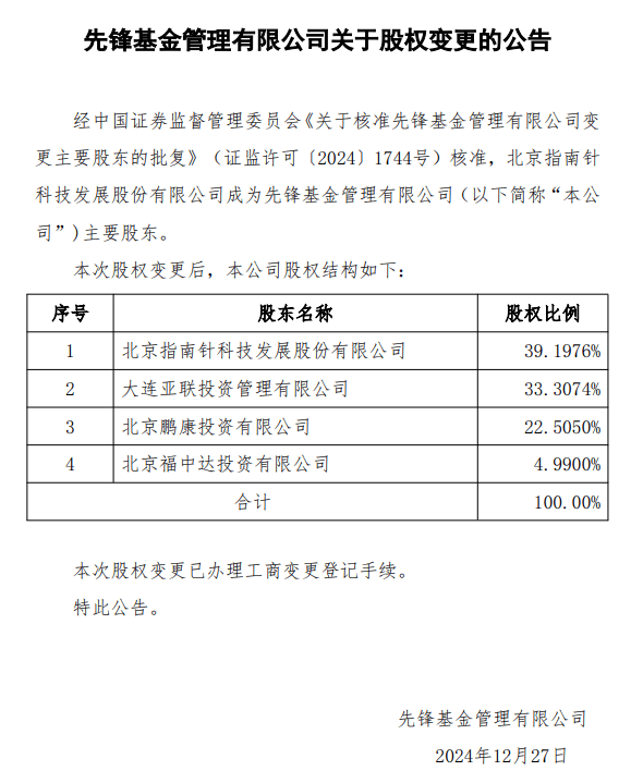 经中国证券监视办理委员会《关于核准前锋基金办理无限公司变动头要股东的批复》(证监许可〔2024〕1744号)核准,指南针科技成长股份无限公司成为前锋基金办理无限公司次要股东。本次股权变动已打点工商变动登记手续。