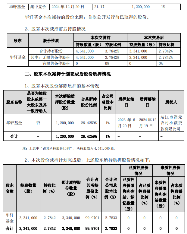 上海唯万密封科技股份无限公司(唯万密封)股东华轩(上海)股权投资基金无限公司(简称:华轩基金)持有公司股份4,541,000股(占公司总股本比例3。7842%)。华轩基金已将其所持有本公司的部门股份打点领会除质押手续,并于2024年12月20日通过集中竞价买卖体例合计减持公司股份1,200,000股,占公司总股本的1%,且此次减持打算已实施完成。