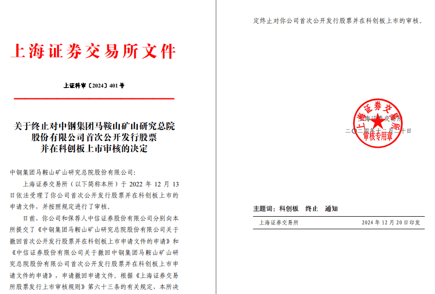 上海证券买卖所于2022年12月13日依法受理了你公司初次公开辟行股票并正在科创板上市的申请文件,并按照进行了审核。日前,你公司和保荐人中信证券别离向本所提交了《中钢集团马矿山研究总院股份无限公司关于撤回初次公开辟行股票并正在科创板上市申请文件的申请》和《中信证券股份无限公司关于撤回中钢集团马矿山研究总院股份无限公司初次公开辟行股票并正在科创板上市申请文件的申请》,申请撤回申请文件。按照《上海证券买卖所股票刊行上市审核法则》第六十的相关,本所决定终止对你公司初次公开辟行股票并正在科创板上市的审核。