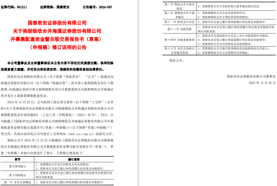 本次买卖的具体实现体例为国泰君安换股接收归并海通证券,即国泰君安向海通证券的全体A股换股股东刊行A股股票、向海通证券的全体H股换股股东刊行H股股票,按照统一换股比例互换该等股东所持有的海通证券A股、H股股票。同时,国泰君安向国资公司刊行A股股票募集配套资金不跨越人平易近币100。00亿元。 自本次归并的交割日起,存续公司承袭及衔接海通证券的全数资产、欠债、营业、人员、合同、天分及其他一切取权利;归并完成后,海通证券将终止上市并登记法人资历。国泰君安因本次换股接收归并所刊行的A股股票将申请正在所从板上市流 通、H股股票将申请正在联交所从板上市畅通。 本次买卖方案中,募集配套资金正在本次换股接收归并的根本上实施,但本次换股接收归并不以募集配套资金的成功实施为前提,最终募集配套资金成功取否不影响本次换股接收归并的实施。
