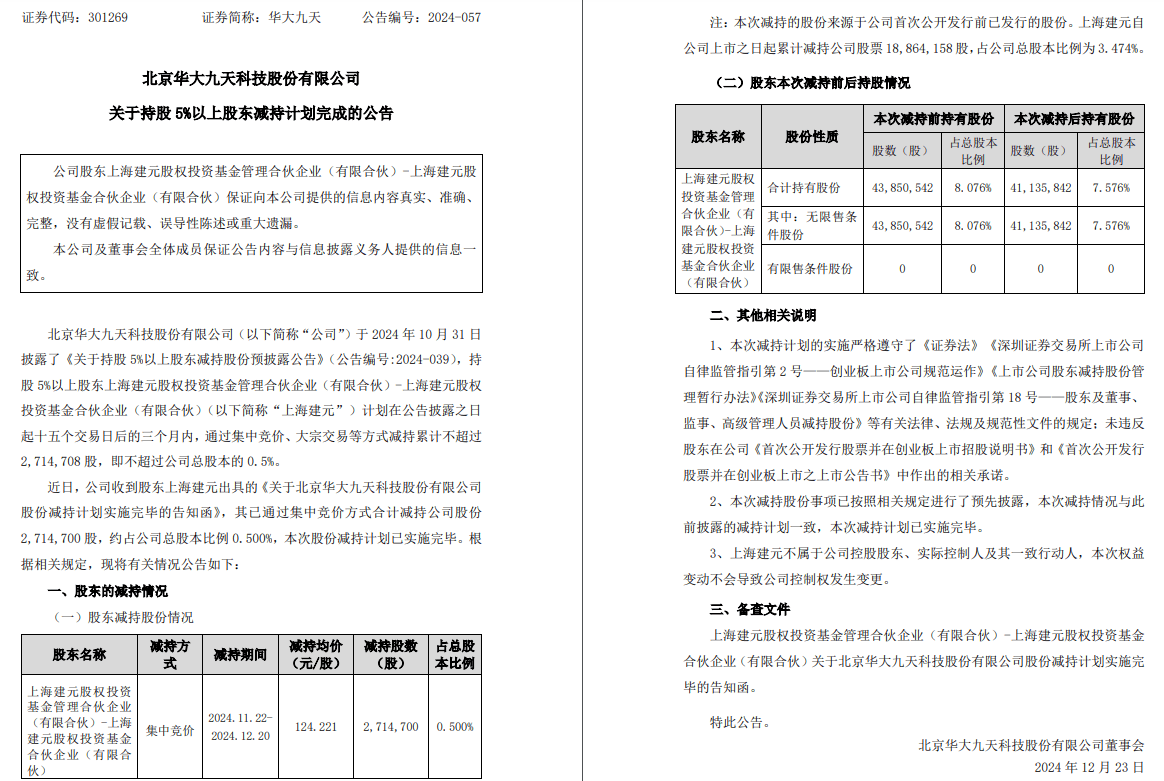 华大科技股份无限公司(华大)持股5%以上股东上海建元股权投资基金办理合股企业(无限合股)-上海建元股权投资基金合股企业(无限合股)(以下简称“上海建元”)已通过集中竞价体例合计减持公司股份2,714,700股,约占公司总股本比例0。500%,本次股份减持打算已实施完毕。