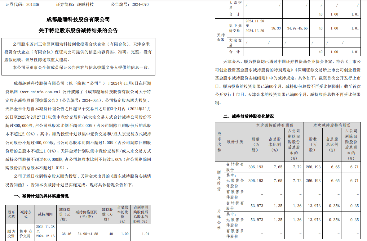 成都趣睡科技股份无限公司(趣睡科技)收到特定股东顺为投资、天津金米出具的《股东减持股份实施环境奉告函》,奉告本次减持打算已实施完成。