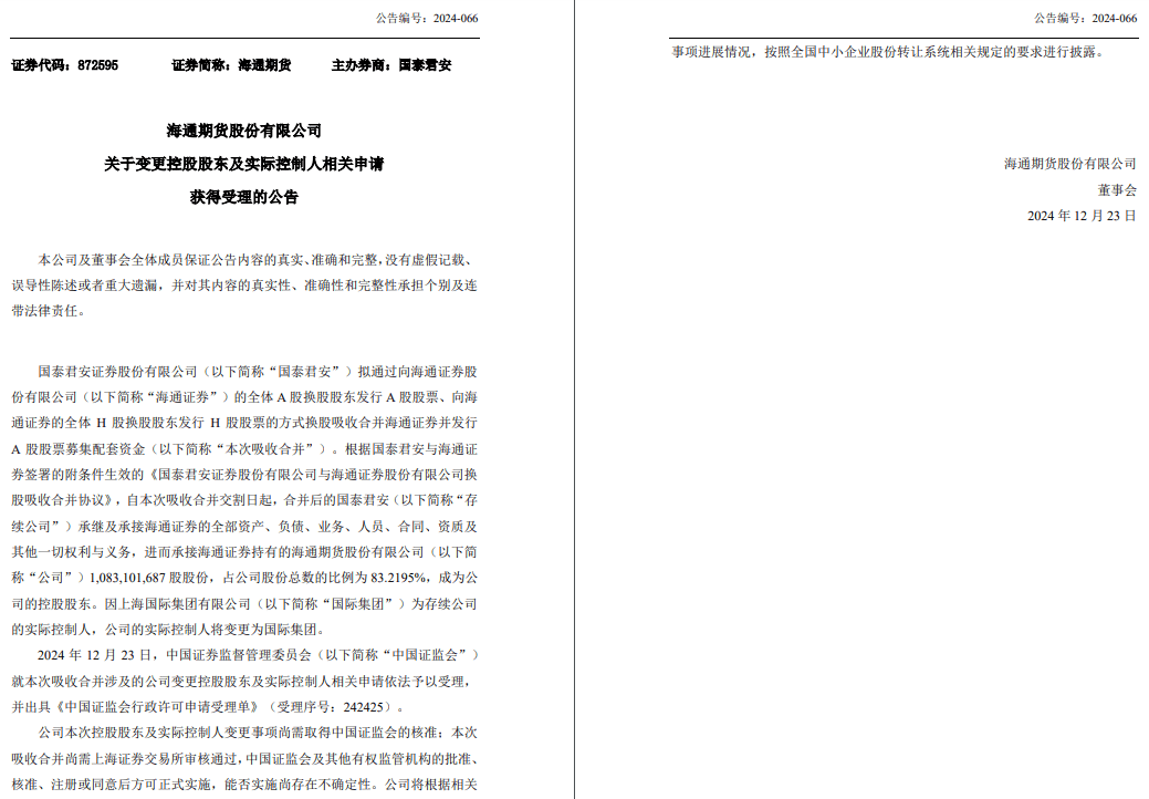 国泰君安拟通过向海通证券的全体A股换股股东刊行A股股票、向海通证券的全体H股换股股东刊行H股股票的体例换股接收归并海通证券并刊行A股股票募集配套资金(以下简称“本次接收归并”)。按照国泰君安取海通证券签订的附前提生效的《换股接收归并和谈》,自本次接收归并交割日起,归并后的国泰君安(以下简称“存续公司”)承袭及衔接海通证券的全数资产、欠债、营业、人员、合同、天分及其他一切取权利,进而衔接海通证券持有的海通期货股份无限公司1,083,101,687股股份,占公司股份总数的比例为83。2195%,成为公司的控股股东。因上海国际集团无限公司(以下简称“国际集团”)为存续公司的现实节制人,公司的现实节制人将变动为国际集团。2024年12月23日,中国证监会就本次接收归并涉及的公司变动控股股东及现实节制人相关申请依法予以受理,并出具《中国证监会行政许可申请受理单》(受理序号:242425)。公司本次控股股东及现实节制人变动事项尚需取得中国证监会的核准;本次接收归并尚需上海证券买卖所审核通过,中国证监会及其他有权监管机构的核准、核准、注册或同意后方可正式实施,可否实施尚存正在不确定性。公司将按照相关事项进展环境,按照全国中小企业股份让渡系统相关的要求进行披露。
