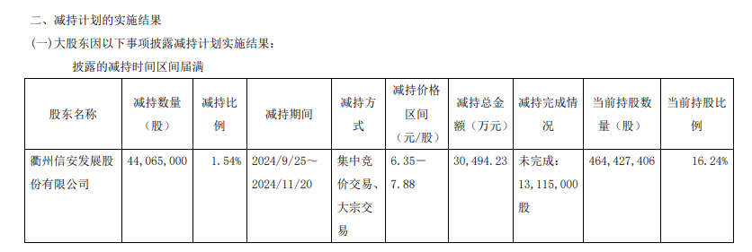 湘财股份股东衢州信安成长股份无限公司(简称:衢州成长)自2024年9月24日至2024年12月23日期间(减持期间不跨越3个月),拟通过集中竞价体例及大买卖体例合计减持不跨越5,718万股,减持比例合计不跨越2%。公司于近日收到衢州成长通知,截至2024年12月23日,公司股东衢州成长打算的减持刻日届满。本次减持打算实施前,衢州成长持有508,492,406股,占总股本的17。78%。截至2024年12月23日,衢州成长通过集中竞价体例减持28,300,000股,占总股本的0。99%;通过大买卖体例减持15,765,000股,占总股本的0。55%。本次减持打算竣事后,衢州成长持有公司股份464,427,406股,占总股本的16。24%。