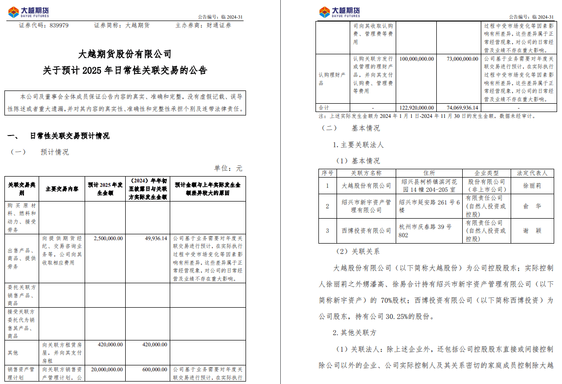 大越股份无限公司(简称:大越股份)为大越期货控股股东;现实节制人徐丽莉之外甥潘高、徐易合计持有绍兴市新宇资产办理无限公司(简称:新宇资产)的70%股权;西博投资无限公司(简称:西博投资)为大越期货股东,持有公司30。25%的股份。(1)大越股份:公司向大越股份租赁衡宇做为总部办公场合,估计费用42万元;公司向大越股份发卖资产办理打算,估计金额500万元;大越股份正在公司开立期货账户进行期货买卖,公司向其收取响应费用,估计金额50万元。(2)新宇资产:新宇资产及其旗下产物正在公司开立期货账户进行期货买卖,公司收取响应费用,估计金额100万元;公司向新宇资产发卖资产办理打算,估计金额500万元;认购新宇资产刊行或办理的理财富物,估计金额10,000万元。(3)西博投资:公司向西博投资发卖资产办理打算,估计金额500万元。(4)其他联系关系方:其他联系关系朴直在公司开立期货账户进行期货买卖,公司向其收取响应费用,估计金额100万元;公司向其他联系关系方发卖资产办理打算,估计金额500万元。