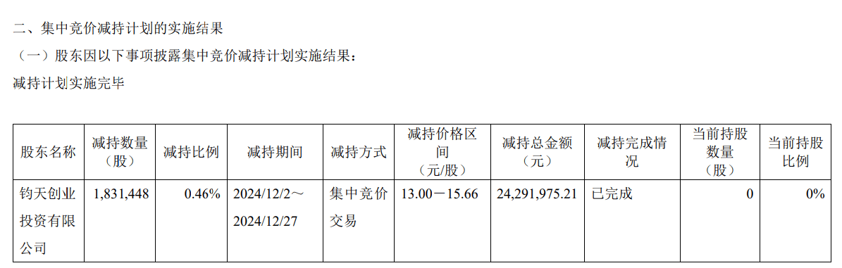 减持打算实施前,成都先导药物开辟股份无限公司(成都先导)股东钧天创业投资无限公司(简称:钧天创投)持有公司股份1,831,448股,占公司总股本的0。46%;钧天创投取公司股东深圳市钧天创业投资无限公司(简称:钧天投资)均由深圳市九野钧天创业投资办理无限公司(简称:九野钧天)担任基金办理人,二者形成分歧步履关系,钧天投资持有公司股份14,102。516股,占公司总股本的3。52%。钧天投资、钧天创逢迎计持有公司股份15,933,964股,占公司总股本的3。98%。公司于2024年12月27日收到股东钧天创投出具的相关奉告函,截至本通知布告披露日,钧天创投正在本减持打算期间通过集中竞价买卖体例累计减持其所持有的公司股份1,831,448股,占公司总股本比例为0。46%。本次权益变更后,钧天创投不再持有公司股份,减持打算实施完毕。