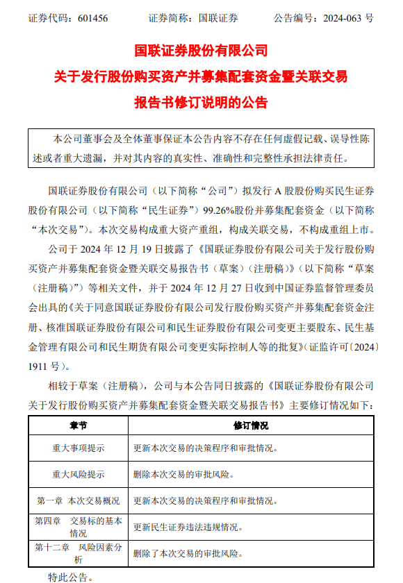 “一、同意国联证券向无锡市国联成长(集团)无限公司(以下简称国联集团)刊行811,725,231股股份、向上海沣泉峪企业办理无限公司(以下简称沣泉峪)刊行361,431,213股股份、向腾云投资办理无限公司刊行130,602,534股股份、向杭州东恒石油无限公司刊行120,291,807股股份、向高新手艺创业投资无限公司刊行102,019,670股股份、向上海张江(集团)无限公司刊行85,922,719股股份、向鲁信投资控股集团无限公司刊行79,561,623股股份、向广州索菲亚投资无限公司刊行68,738,175股股份、向台州市国有本钱运营集团无限公司刊行51,553,632股股份、向公共交通(集团)股份无限公司刊行51,553,631股股份、向青岛金源平易近福股权投资合股企业(无限合股)刊行49,147,795股股份、向嘉兴厚润泽汇创业投资合股企业(无限合股)刊行42,961,359股股份、向新乡白鹭投资集团无限公司刊行39,292,116股股份、向申能(集团)无限公司刊行34,369,088股股份、向上海华谊集团投资无限公司刊行34,369,088股股份、向洛阳利尔耐火材料无限公司刊行34,369,087股股份、向上海雄建投资办理合股企业(无限合股)刊行34,025,397股股份、向国际信任股份无限公司刊行31,039,606股股份、向东方国际创业股份无限公司刊行30,932,179股股份、向山东鲁信实业集团无限公司刊行26,056,194股股份、向华峰集团无限公司刊行25,776,816股股份、向上海水遥企业办理征询办事无限义务公司刊行25,776,815股股份、向兖矿本钱办理无限公司刊行24,917,588股股份、向嘉兴德宁生晖股权投资合股企业(无限合股)刊行24,573,897股股份、向绍兴越旺企业办理征询合股企业(无限合股)刊行24,557,572股股份、向共青城人和智胜股权投资合股企业(无限合股)刊行21,652,525股股份、向东方国际(集团)无限公司刊行20,621,452股股份、向嘉兴德宁正鑫股权投资合股企业(无限合股)刊行19,418,536股股份、向上海张江高科技园区开辟股份无限公司刊行17,184,544股股份、向上海浦东立异投资成长(集团)无限公司刊行17,184,544股股份、向上海国际港务(集团)股份无限公司刊行17,184,544股股份、向上海韵建投资无限公司刊行17,184,544股股份、向上海久事投资办理无限公司刊行17,184,544股股份、向时代出书传媒股份无限公司刊行17,184,543股股份、向地素时髦股份无限公司刊行17,184,543股股份、向青岛海洋成长集团无限公司刊行17,184,543股股份、向杭州崇福众财投资合股企业(无限合股)刊行17,184,543股股份、向湖北华仓宏嘉股权投资基金合股企业(无限合股)刊行14,606,862股股份、向共青城平易近信投资合股企业(无限合股)刊行13,263,407股股份、向共青城平易近隆投资合股企业(无限合股)刊行9,871,649股股份、向共青城平易近新投资合股企业(无限合股)刊行9,676,734股股份、向四川鼎祥股权投资基金无限公司刊行8,592,271股股份、向橙叶志远(东营)股权投资基金核心(无限合股)刊行8,592,271股股份、向杭州普华晖阳投资合股企业(无限合股)刊行8,592,271股股份、向嘉兴德宁宏阳一期股权投资合股企业(无限合股)刊行5,155,363股股份采办相关资产的注册申请。