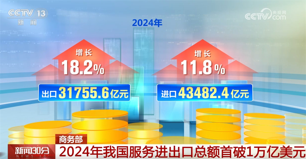 商务部数据显示,2024年,我国办事商业实现快速增加,全年办事进出口总额初次冲破1万亿美元,规模创下汗青新高,布局持续优化,展示出广漠的成长潜力。2024年,中国全年办事进出口总额75238亿元,同比增加14。4%。此中,出口31755。6亿元,增加18。2%;进口43482。4亿元,增加11。8%;办事商业逆差11726。8亿元,比上年削减314。3亿元。商务部研究院国际办事商业研究所所长李俊称:“中国年度办事进出口规模初次冲破1万亿美元,创出了汗青新高,增加速度较着加速,国际合作力稳步加强,正在货色和办事商业总额中的地位持续提拔,展示出了较大的成长活力取潜力。”