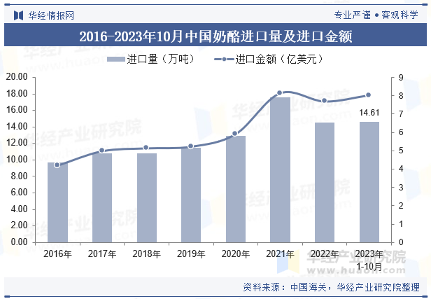 跟着消费者对奶酪产物的认知和需求不竭提拔,以及国内乳成品消费市场的持续增加,奶酪市场规模将持续扩大。数据显示,我国奶酪零售市场从2017年的51。54亿元增加至2022年的142。94亿元,行业增速177。34%。消费者对奶酪产物的需求越来越多样化,从保守的干酪到各类口感和风味的新型奶酪,如软质奶酪、蓝纹奶酪等,都将遭到消费者的欢送。近年来,我国奶酪进口数量大幅添加,比拟之下,我国奶酪出口数量较少。按照中国海关数据,2022年我国奶酪进口数量为14。54万吨,同比下降17。4%;2023年略有回升。