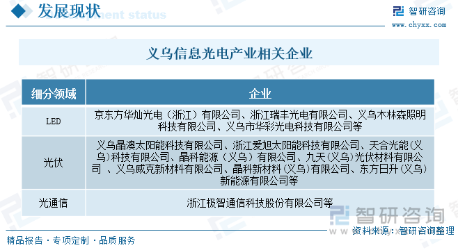 以光通信、光电显示、光照明(半导体照明)和光伏为从体的消息光电财产,已成为电子消息财产中高成长、高带动的计谋性财产,具有优良的成长前景,消息光电财产是义乌市新培育兴起的计谋性新兴财产,财产成长势头迅猛,已成为义乌市主要从导财产之一。义乌市打制了LED、光伏、电子纸等光电财产链,财产成长初具规模,财产集群劣势较着。晶科能源、晶澳太阳能、天合光能等一批世界级光伏企业先后落户义乌。LED财产也集聚了华灿光电、瑞丰光电、木林森照明等一批国内龙头企业,构成了完整的LED芯片、封拆、灯具财产链。