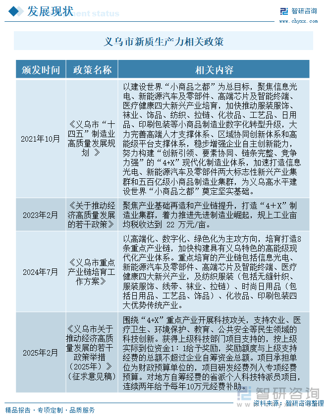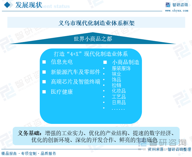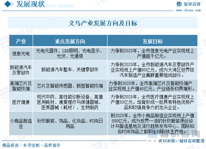正在《义乌市“十四五”制制业高质量成长规划 》政策中,义乌市明白了“4+X”财产沉点成长标的目的及方针。提出到2025年,全市小商品制制业实现规上产值 500亿元,成为世界一流的针织服拆原创设想取智制及风行趋向发布核心、国际出名时髦饰品之都和全球彩妆从产地。力争到2025年,全市消息光电财产实现规上产值超千亿元。力争到2025年,全市新能源汽车及零部件财产实现规上产值60亿元,成为大湾区世界级汽车制制财产集群主要构成部门。