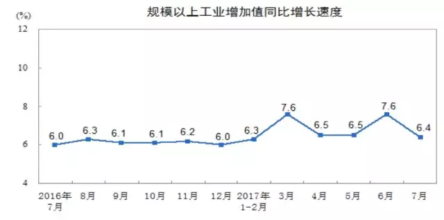 2017年7月份,规模以上工业添加值同比现实增加6。4%,比6月份回落1。2个百分点,比上年同月加速0。4个百分点。从环比看,7月份,规模以上工业添加值比上月增加0。41%。1-7月份,规模以上工业添加值同比增加6。8%。
