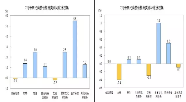 各类商品及办事价钱同比变更方面:7月份,食物烟酒价钱同比下降0。1%,影响CPI下降约0。04个百分点。其他七大类价钱同比六涨一降。